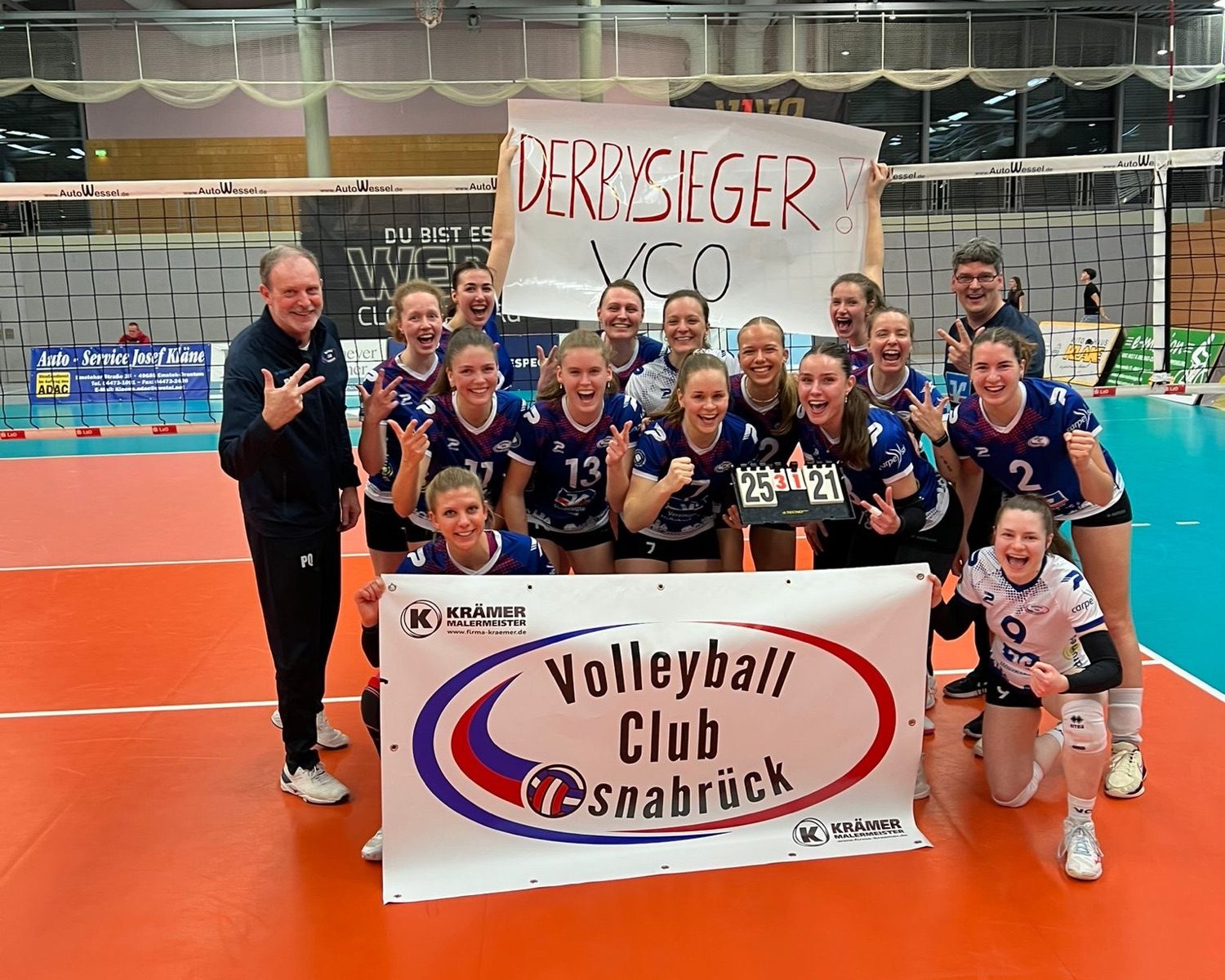 „Ich bin erstmal erleichtert und stolz. Der Derbysieg ist schön – gerade nach dem Hinspiel und dem sehr engen 3:2-Tiebreaksieg. Es war eine Teamleistung, ein schönes Spiel war es aber nicht“, fasste Kraus seine Eindrücke zusammen. „Cloppenburg ist halt auch unangenehm zu spielen. Die hauen drauf wie auf kaltes Eisen. Die Aufschläge sind, wenn sie denn dann kommen, sehr gut. Wir haben jedoch Glück gehabt, dass sie einige in einigen Phasen verschlagen haben“, so der VCO-Coach weiter. „Unser Selbstbewusstsein ist schon ziemlich angeknackst gewesen nach den drei Niederlagen und dem Wie beim 0:3 gegen Bonn. Deshalb ist es echt sehr schön, gewonnen zu haben. Das war auch punktemäßig deutlich, wenn es sich für die Mädels vielleicht auch nicht so angefühlt hat. Das Ziel bleibt weiter, Achter zu bleiben.“